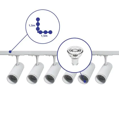 | Fabrikantnaam | Complete L shaped 1-Phase Track Set White incl. 6x Spot fixture + GU10 2700K 3W Dim – 1,5 x 1,5 mete | |