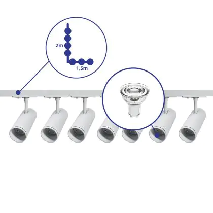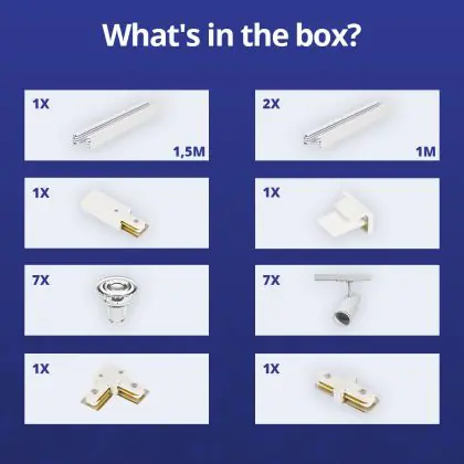 | Fabrikantnaam | Complete L shaped 1-Phase Track Set White incl. 7x Spot fixture + GU10 2700K 3W Dim – 1,5 x 2 meter | |