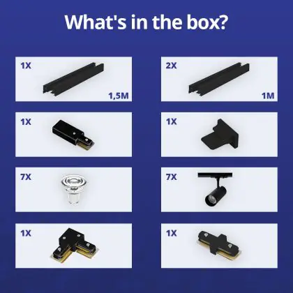 | Fabrikantnaam | Complete L shaped 1-Phase Track Set Black incl. 7x Spot fixture + GU10 2700K 3W Dim – 1,5 x 2 meter | |