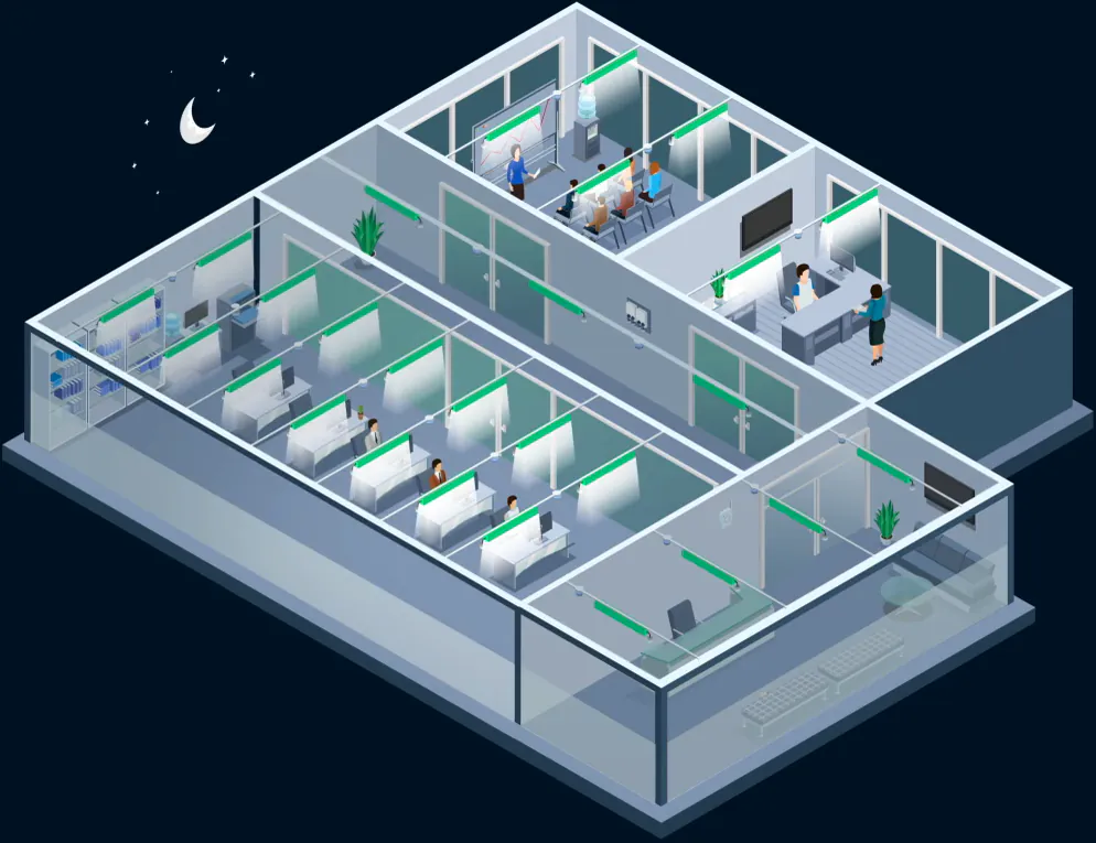 De verlichting houdt rekening met natuurlijk licht en het tijdstip van de dag, en kan daarom worden gebruikt voor daylight harvesting en Human Centric Lighting.