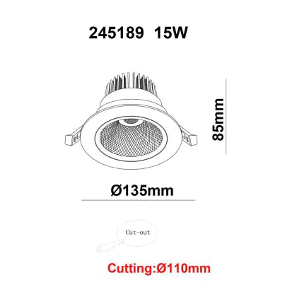 | Fabrikantnaam | White label LED Downlight Round Tiltable 15W 1200lm 60D 930 UGR19 CutoutØ110mm FrameØ135mm | |