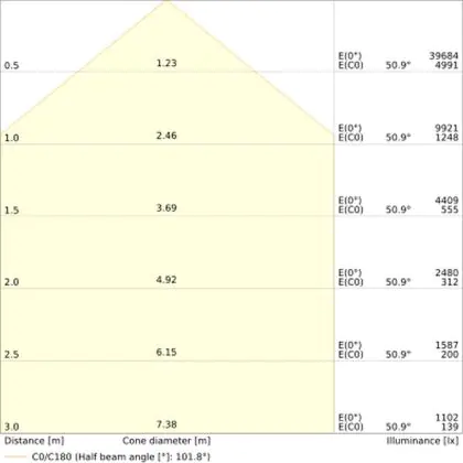 De gradenbundel geeft informatie over hoe breed het licht wordt uitgestraald. Dit zit tussen de 0 en 360 graden (D). Hoe kleiner de hoek, hoe specifieker de lichtbundel is. Over het algemeen is een smalle gradenbundel perfect voor sfeer- of accentverlichting, terwijl een brede gradenbundel ideaal is om grote oppervlaktes te verlichten.