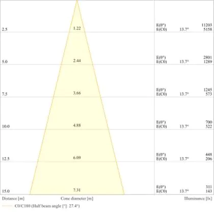 De gradenbundel geeft informatie over hoe breed het licht wordt uitgestraald. Dit zit tussen de 0 en 360 graden (D). Hoe kleiner de hoek, hoe specifieker de lichtbundel is. Over het algemeen is een smalle gradenbundel perfect voor sfeer- of accentverlichting, terwijl een brede gradenbundel ideaal is om grote oppervlaktes te verlichten.