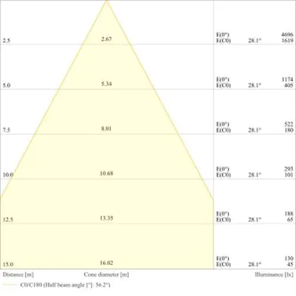 De gradenbundel geeft informatie over hoe breed het licht wordt uitgestraald. Dit zit tussen de 0 en 360 graden (D). Hoe kleiner de hoek, hoe specifieker de lichtbundel is. Over het algemeen is een smalle gradenbundel perfect voor sfeer- of accentverlichting, terwijl een brede gradenbundel ideaal is om grote oppervlaktes te verlichten.