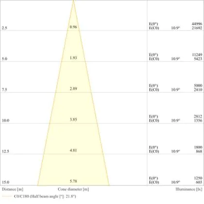 De gradenbundel geeft informatie over hoe breed het licht wordt uitgestraald. Dit zit tussen de 0 en 360 graden (D). Hoe kleiner de hoek, hoe specifieker de lichtbundel is. Over het algemeen is een smalle gradenbundel perfect voor sfeer- of accentverlichting, terwijl een brede gradenbundel ideaal is om grote oppervlaktes te verlichten.