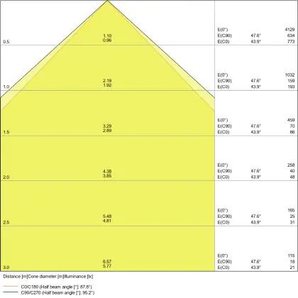 De gradenbundel geeft informatie over hoe breed het licht wordt uitgestraald. Dit zit tussen de 0 en 360 graden (D). Hoe kleiner de hoek, hoe specifieker de lichtbundel is. Over het algemeen is een smalle gradenbundel perfect voor sfeer- of accentverlichting, terwijl een brede gradenbundel ideaal is om grote oppervlaktes te verlichten.