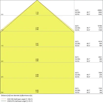 De gradenbundel geeft informatie over hoe breed het licht wordt uitgestraald. Dit zit tussen de 0 en 360 graden (D). Hoe kleiner de hoek, hoe specifieker de lichtbundel is. Over het algemeen is een smalle gradenbundel perfect voor sfeer- of accentverlichting, terwijl een brede gradenbundel ideaal is om grote oppervlaktes te verlichten.