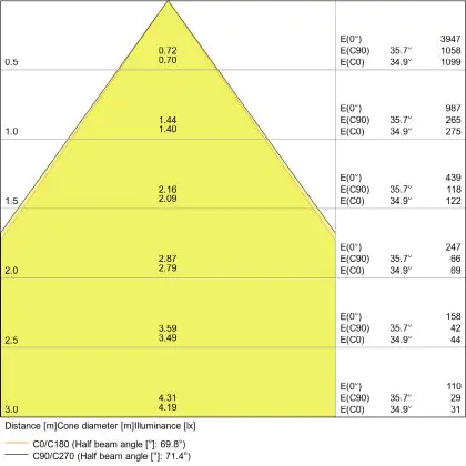 De gradenbundel geeft informatie over hoe breed het licht wordt uitgestraald. Dit zit tussen de 0 en 360 graden (D). Hoe kleiner de hoek, hoe specifieker de lichtbundel is. Over het algemeen is een smalle gradenbundel perfect voor sfeer- of accentverlichting, terwijl een brede gradenbundel ideaal is om grote oppervlaktes te verlichten.