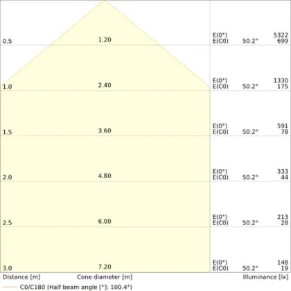 De gradenbundel geeft informatie over hoe breed het licht wordt uitgestraald. Dit zit tussen de 0 en 360 graden (D). Hoe kleiner de hoek, hoe specifieker de lichtbundel is. Over het algemeen is een smalle gradenbundel perfect voor sfeer- of accentverlichting, terwijl een brede gradenbundel ideaal is om grote oppervlaktes te verlichten.