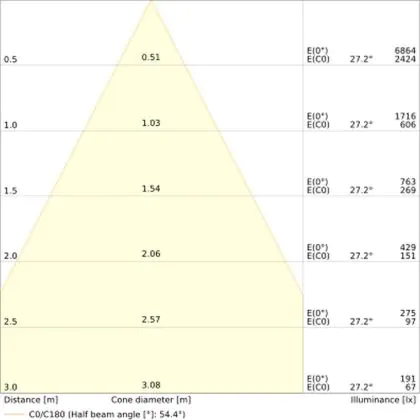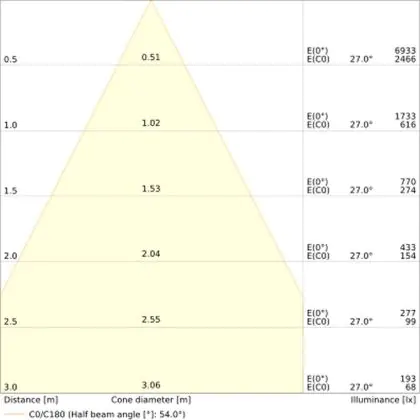 De gradenbundel geeft informatie over hoe breed het licht wordt uitgestraald. Dit zit tussen de 0 en 360 graden (D). Hoe kleiner de hoek, hoe specifieker de lichtbundel is. Over het algemeen is een smalle gradenbundel perfect voor sfeer- of accentverlichting, terwijl een brede gradenbundel ideaal is om grote oppervlaktes te verlichten.