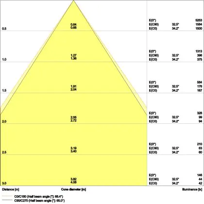 De gradenbundel geeft informatie over hoe breed het licht wordt uitgestraald. Dit zit tussen de 0 en 360 graden (D). Hoe kleiner de hoek, hoe specifieker de lichtbundel is. Over het algemeen is een smalle gradenbundel perfect voor sfeer- of accentverlichting, terwijl een brede gradenbundel ideaal is om grote oppervlaktes te verlichten.