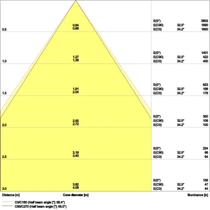De gradenbundel geeft informatie over hoe breed het licht wordt uitgestraald. Dit zit tussen de 0 en 360 graden (D). Hoe kleiner de hoek, hoe specifieker de lichtbundel is. Over het algemeen is een smalle gradenbundel perfect voor sfeer- of accentverlichting, terwijl een brede gradenbundel ideaal is om grote oppervlaktes te verlichten.