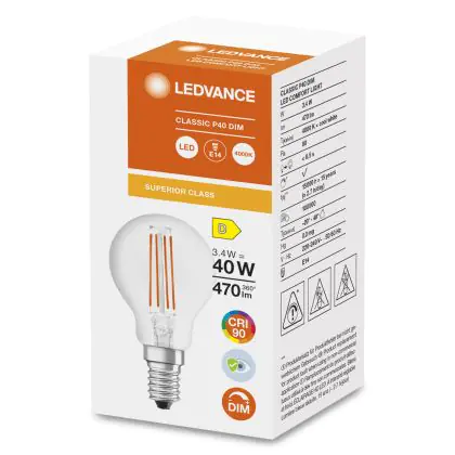 Beschrijving Ledvance Superior Classic LED E14 Kogel Filament Helder 3.4W 470lm - 940 Koel Wit | Dimbaar - Beste Kleurweergave