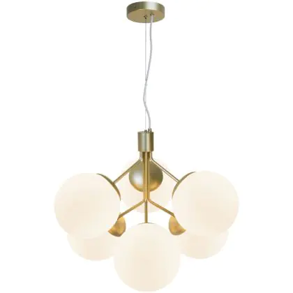 Deze Ivona hanglamp is messing met opaal glas, wat een glamoureuze en elegante uitstraling creëert. Het armatuur heeft 6 lampen met een E27 fitting (max. 28W). De hanglamp is dimbaar in combinatie met een dimbare lamp.