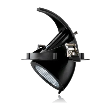 Een downlight is eigenlijk een ronde inbouwspot voor plafonds. In winkels (waar deze spots veel gebruikt worden) zitten veel downlights met conventionele CDM lampen. Deze zijn nu eenvoudig vervangbaar door LED. Een downlight die je uit het plafond kunt kantelen zoals deze, wordt ook wel een banaanspot genoemd.
