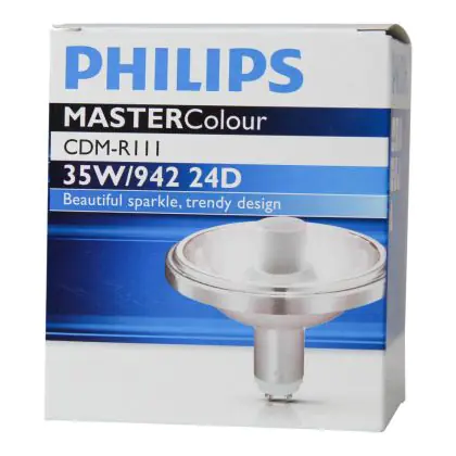 De Philips Mastercolour CDM-R111 serie kenmerkt zich door haar 111mm reflector, deze lampen zijn geschikt voor plaatsing in een open armatuur. De Philips CDM-R111 35W 942 GX8.5 24D (MASTERColour) lampen zijn compacte ontladingslampen met een eenvoudige GX8.5 lampvoet. Het is niet mogelijk om de lampen te dimmen.