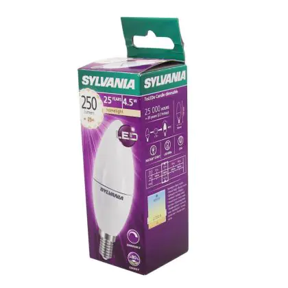 De Sylvania ToLEDo Candle E14 is het perfecte alternatief als LED vervanger van de ouderwetse kaarsgloeilamp. De ToLEDo Candle ziet er stijlvol uit en is zeer geschikt voor het gebruik op plekken waar sfeer benodigd is door zijn aantrekkelijke vorm en warm witte kleur. Door zijn uiterlijk kan de lamp zowel in het zicht als uit het zicht gebruikt worden en daardoor zeer geschikt voor kroonluchters of andere open armaturen. Maar uiteraard is de ToLEDo Candle ook toepasbaar in elk ander armatuur met een E14 fitting.