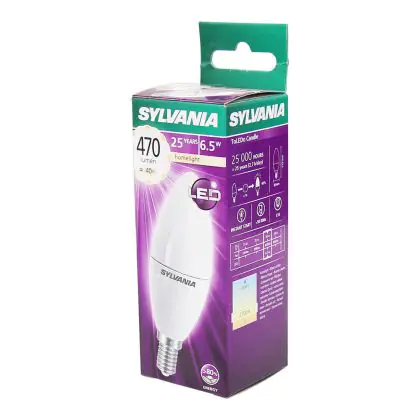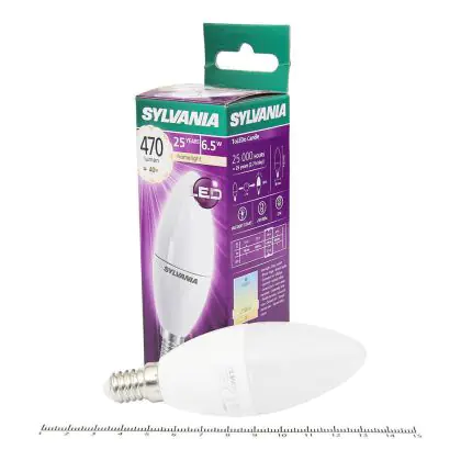 De Sylvania ToLEDo Candle E14 is het perfecte alternatief als LED vervanger van de ouderwetse kaarsgloeilamp. De ToLEDo Candle ziet er stijlvol uit en is zeer geschikt voor het gebruik op plekken waar sfeer benodigd is door zijn aantrekkelijke vorm en warm witte kleur. Door zijn uiterlijk kan de lamp zowel in het zicht als uit het zicht gebruikt worden en daardoor zeer geschikt voor kroonluchters of andere open armaturen. Maar uiteraard is de ToLEDo Candle ook toepasbaar in elk ander armatuur met een E14 fitting.